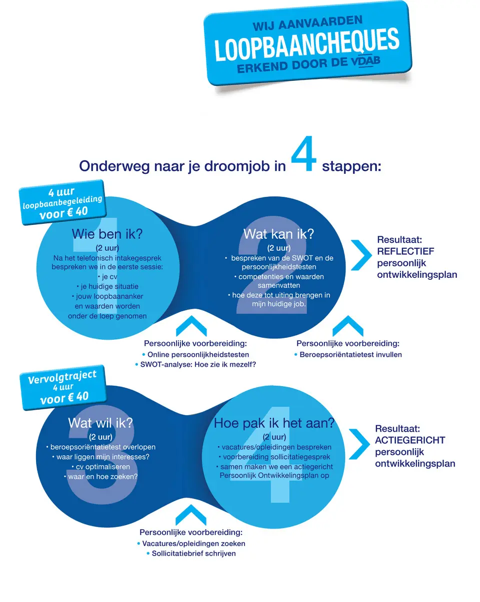 Ben je ervan overtuigd geraakt dat loopbaanbegeleiding de juiste oplossing kan zijn voor jou? Vraag dan alvast je loopbaancheques aan bij de VDAB en maak vrijblijvend een afspraak met Loopbaanexpert voor een gratis kennismakingsgesprek.